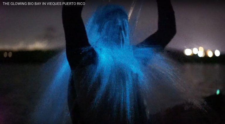La bahía mas brillosa del mundo que tiene el fenómeno mágico de bioluminiscencia se encuentra en Bahía Mosquito en Vieques, PR. LA superficie del agua brilla un brillante azul-verde en la noche debido a un microorganismo bioluminiscente.